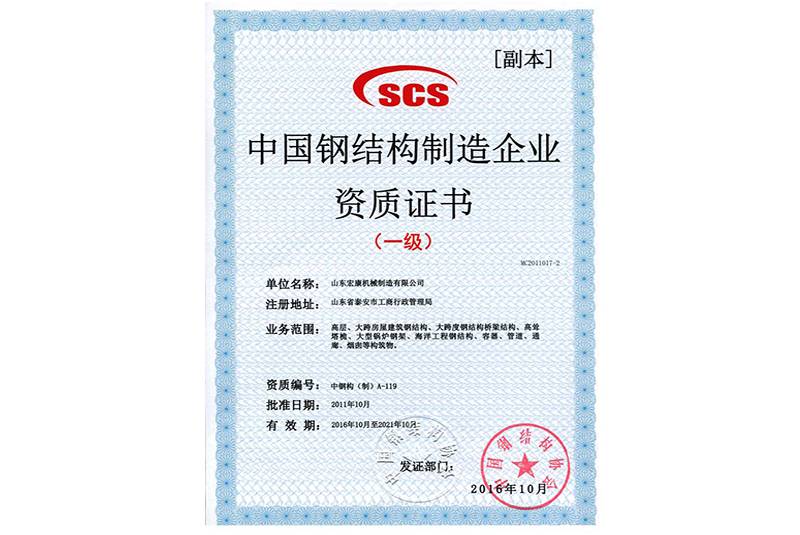 中國鋼結構製造企(qǐ)業資(zī)質證書(一級)