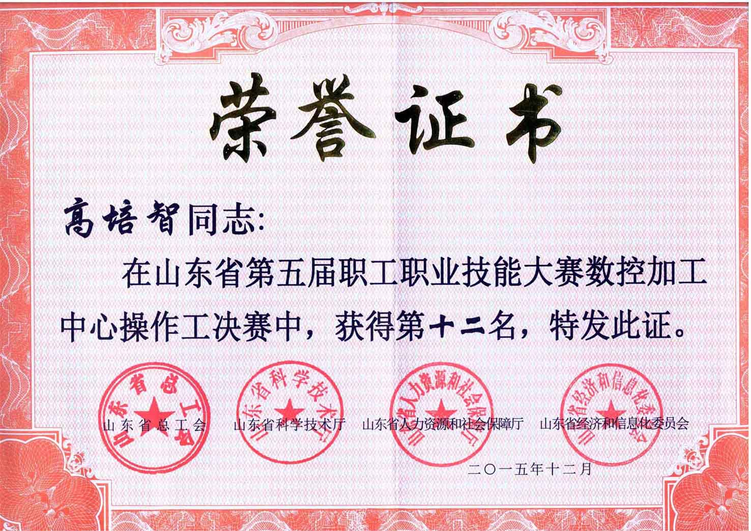 公司員工高培智在山東省第五(wǔ)屆職工職業技能大賽數控加工中心操作(zuò)工決賽中,獲得第十二名,日前受到省總工(gōng)會、省科技廳、省人力資(zī)源和社會保障廳和省經信委四部門聯(lián)合表彰。