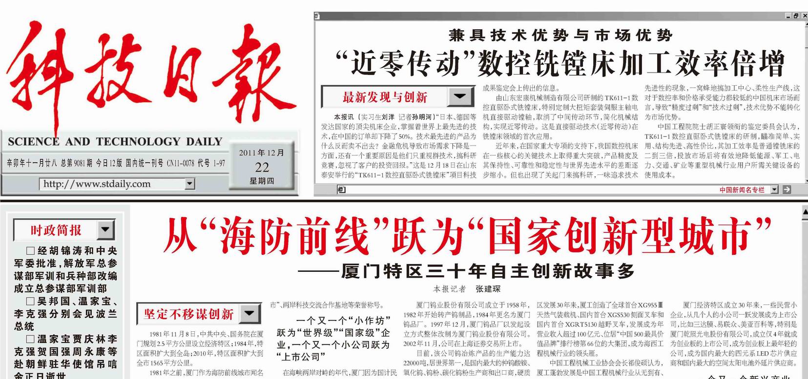 “近零傳動”數控銑鏜床加工效(xiào)率倍(bèi)增《科技日報(bào)》 2011年12月22日總第9081期