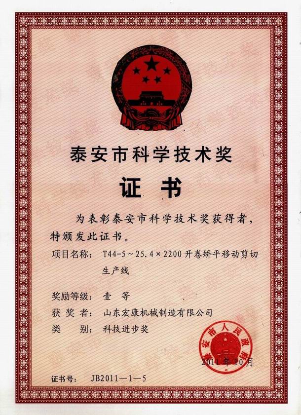 4月6日,全市科學(xué)技術獎勵大會隆重召開。我集團www.草莓视频.com機械公司“T44-5-25.4x2200開卷矯平移動剪切生產線”項目榮獲2011泰安市科(kē)技進步一等獎,副總經理(lǐ)康峰參(cān)加會議並代表集團公司上台領獎.