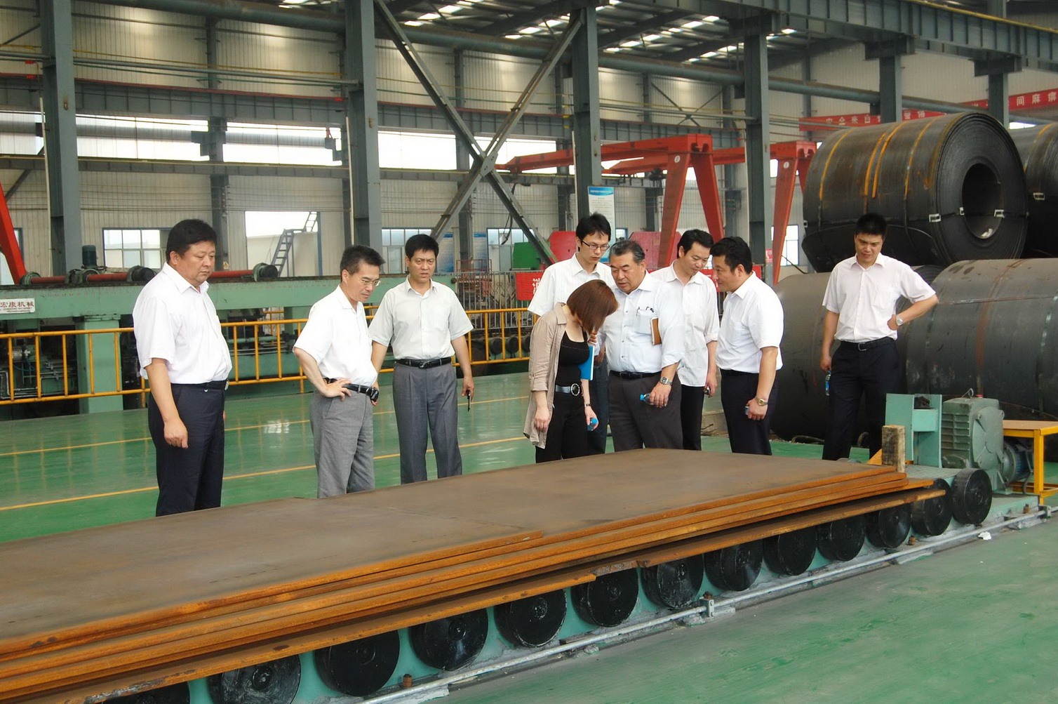7月29日,日本SUMIKURA機械株(zhū)式會社代表取締役、寧波住倉機械有限公司董事長兼總經理紀明嶽(左二)及株式會(huì)社取締役川畑裕(右四(sì))一行來公司考察合作項目。公司董事長(zhǎng)、總經理康鳳明,常(cháng)務副總經理潘憲平、副總(zǒng)經理朱洪軍等領導陪同考察。圖(tú)為客商在鋼鐵物流配送有限(xiàn)公司參觀考察移動(dòng)剪切生產線加工情況。