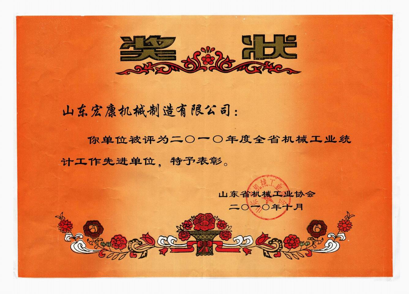 10月20日至(zhì)22日,山(shān)東省機械工業統計信息工作會議在(zài)棗莊市(shì)滕州召開,我公司被評為(wéi)“2010年度全省機械工業統計工作先進單位”。