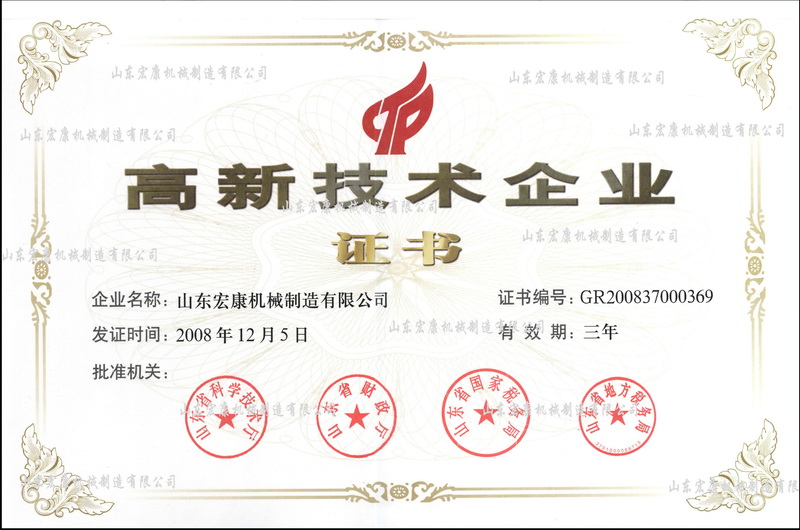 科技部高新技術企業認定管理工作網公示了山東省2008年第一批高新技術企業名單,山(shān)東www.草莓视频.com(kāng)機械(xiè)製造有限公(gōng)司公司榜上有名,證書編號:GR200837000369。